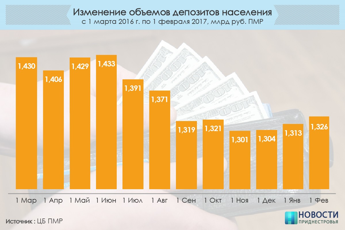 После некоторого падения в июле, сентябре и ноябре 2016 года в Приднестровье вновь начал расти объем депозитов населения. За последний месяц он увеличился на 13 миллионов рублей – до 1 миллиарда 326 миллионов.