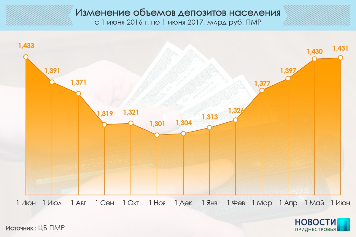 Тирасполь, 14 июня. /Новости Приднестровье/. В мае ненамного (на 1,8 миллиона рублей), но вновь вырос объем вкладов населения Приднестровья в коммерческих банках. Этот рост продолжается с начала года. Объем депозитов к началу июня составил более 1 миллиарда 430 миллионов рублей.