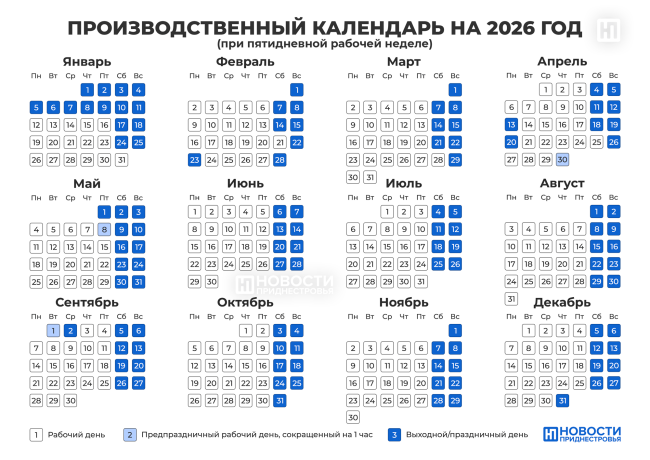 08 Ноя.., 2025, 13:21Тирасполь, 8 ноября. /Новости Приднестровья/. В новом производственном календаре на 2026 год (для пятидневной рабочей недели) учтены 11-дневные новогодние выходные и перенос четырёх рабочих дней в начале января на субботы других месяцев. Напомним, решение об этом было принято Правительством ПМР на этой неделе.