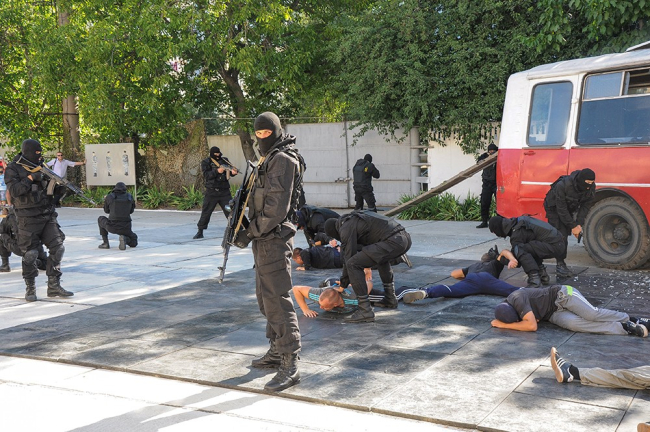 После торжественного марша спецназовцы продемонстрировали свое искусство владения рукопашным боем с огнестрельным оружием. Завершился мастер-класс зрелищной имитацией спецоперации по освобождению заложников.