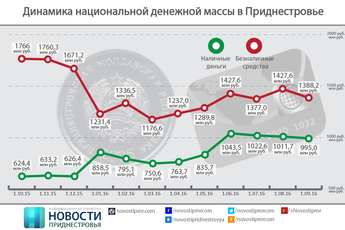 Однако в общем объёме денежной базы количество средств в иностранной валюте по-прежнему превышает объём наличных и безналичных приднестровских рублей. По состоянию на 1 сентября на иностранную валюту приходится 56,1% от общего объёма денежной базы, а на наличные и безналичные рубли 43,9%.