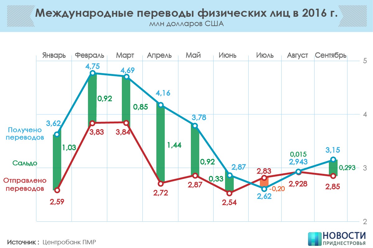 Тирасполь, 25 октября. /ИА «Новости Приднестровья"/. В последние 2 месяца ситуация на рынке денежных переводов несколько стабилизировалась. В августе и сентябре зафиксировано положительное сальдо, соответственно число средств отправленных в республику физлицами посредством электронных систем (без открытия банковского счёта) превышает объём переводов из ПМР за границу.