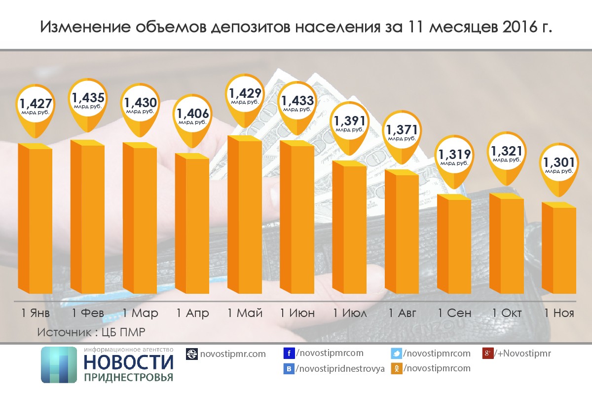 23 Ноя.., 2016, 18:50Тирасполь, 23 ноября. /ИА «Новости Приднестровья»/. По итогам 10 месяцев этого года объём депозитов населения в коммерческих банках республики продолжает снижаться. Так, по данным ПРБ, к 1 ноября он уменьшился на 8,8% – с 1 млрд 426,8 млн (в январе) до 1 млрд 301,1 (в ноября) млн рублей.