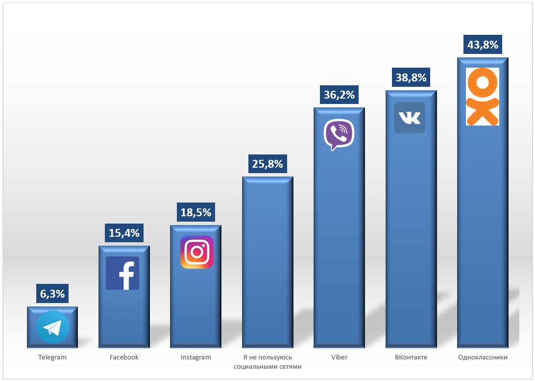 Facebook, который является глобальным лидером, в Приднестровье только на шестой строчке с показателем в 15%. Это в основном жители Тирасполя в возрасте 26-45 лет. А если говорить о социальном статусе, то люди, находящиеся на руководящих должностях, пользуются в основном именно им.