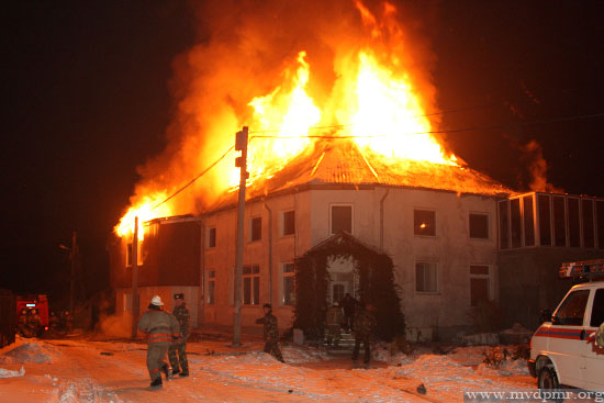 На полную ликвидацию пожара площадью 300 кв. м ушло около 6 часов. Огонь уничтожил кровлю здания и несколько комнат с мебелью и личными вещами. Никто не пострадал. Причина пожара и сумма материального ущерба устанавливаются инспекторами Госпожнадзора УпЧС МВД ПМР.