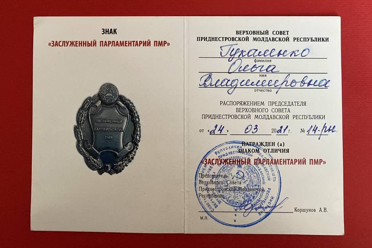 Ольга Гукаленко награждена знаком отличия «Заслуженный парламентарий ПМР»