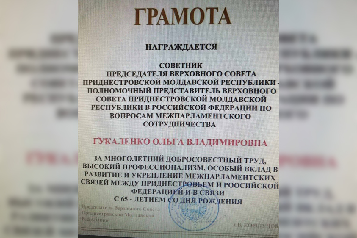 В честь 65-летия, за многолетний добросовестный труд и особый вклад в развитие и укрепление межпарламентских связей между Приднестровьем и Россией Ольга Гукаленко награждена почетной грамотой ВС ПМР и знаком отличия «Заслуженный парламентарий ПМР».