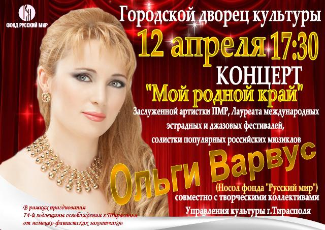 Тирасполь, 11 апреля. /Новости Приднестровья/. Завтра в рамках празднования 74-й годовщины освобождения Тирасполя от немецко-фашистских захватчиков в Городском дворце культуры состоится праздничный концерт «Мой родной край». На сцене выступит Заслуженная артистка Приднестровья Ольга Варвус.