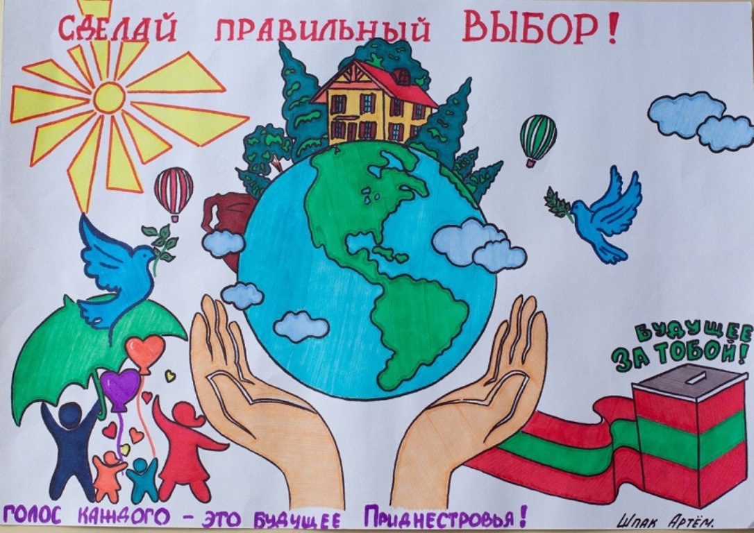 Дети рисовали свой город, свою страну, земной шар. Писали о том, как важен голос каждого. На рисунках – символы мира: белые голуби, воздушные шары, а ещё семьи, которые вместе идут на выборы, потому что, как пишут юные художники, «наше будущее в наших руках».