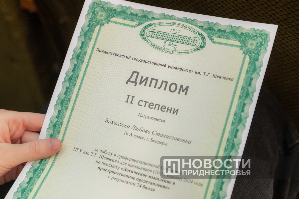 Тирасполь, 7 февраля. /Новости Приднестровья/. В Приднестровском госуниверситете им. Т. Г. Шевченко подвели итоги профориентационной олимпиады. Из более чем тысячи участников отобрали 70 победителей. Им вручили грамоты, сообщает Первый Приднестровский телеканал. Причём грамот оказалось больше, чем призёров, так как некоторые участники получили сразу несколько наград.
