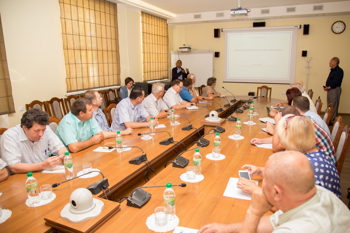 Тирасполь, 4 июля. /Новости Приднестровья/. В Приднестровском госуниверситете прошла встреча с английскими гостями – представителями ассоциации консервативного (органического) земледелия Великобритании, профессором Амиром Кассамом и фермером Тони Рэйнолдом. Встреча стала продолжением вчерашнего разговора, только его участниками были не фермеры и сотрудники Минсельхозприроды, а представители научного сообщества республики. Это сотрудники ПНИИ с/х, профильных кафедр ПГУ, НИИ экологии и природных ресурсов. Тема та же – консервативное земледелие. Разговор о нём в Приднестровье ведут уже давно, ему посвящали ряд практикумов и семинаров. Причина проста – обеднение почвы, её эрозия, снижение урожайности (при возрастающих вложениях в обработку земли), засухи и другие факторы вынуждают фермеров думать о том, как вернуть земле былое плодородие.