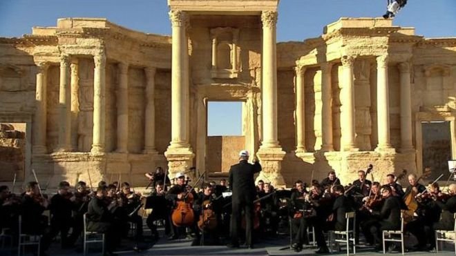 Оркестр Мариинского театра под управлением Валерия Гергиева 5 мая дал концерт в сирийской Пальмире, освобожденной от боевиков «Исламского государства» при поддержке российских военных, сообщает ТАСС. Перед началом концерта было продемонстрировано видеообращение Владимира Путина, в котором он поблагодарил музыкантов за то, что они решили организовать это культурное мероприятие в недавно освобожденном городе.
