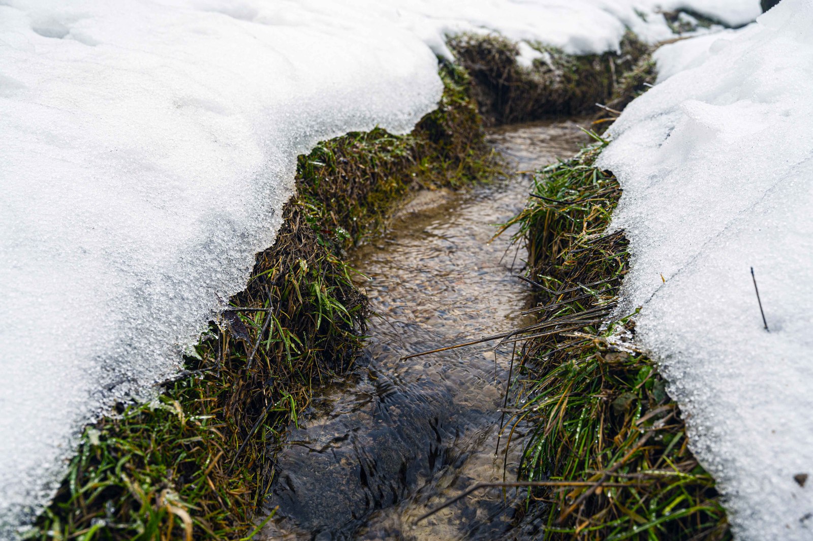 Но родниковая вода всё же теплее окружающей среды. От ручья поднимается пар.