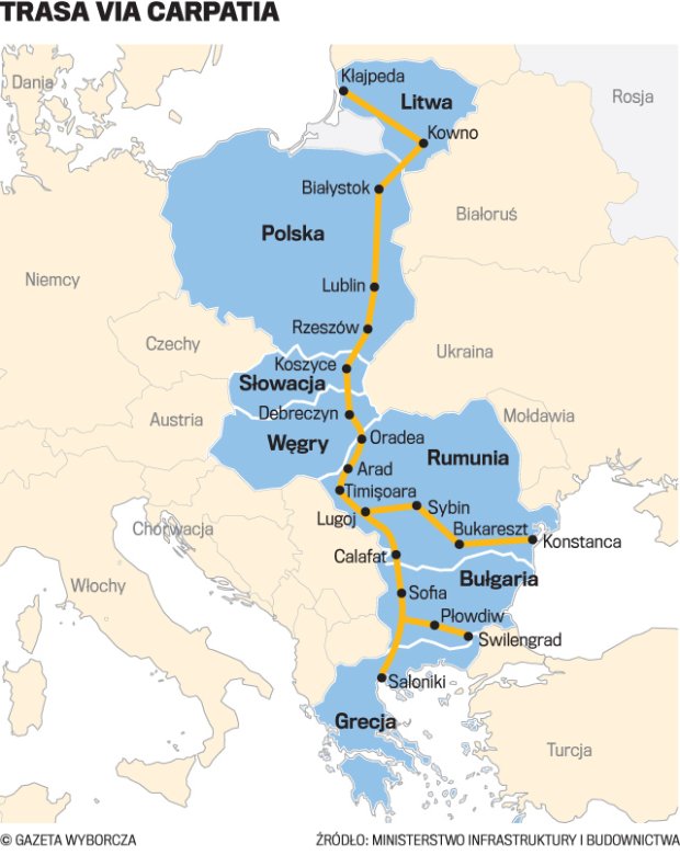 Дорога Via Carpatia должна соединить территорию 7 стран (Литва, Польша, Словакия, Венгрия, Румыния, Болгария, Греция). Главный маршрут проходит от Клайпеды до Салоник через Кошице, Дебрецен, Тимишоару, Софию. В Румынии и Болгарии предполагается строительство двух ответвлений – в сторону портового города Констанца и к границе с Турцией.