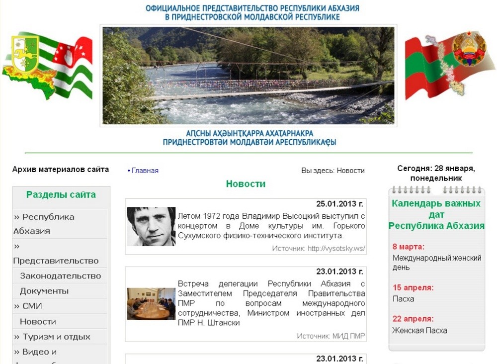 28 Янв.., 2013, 15:15На сайте можно будет узнать не только о деятельности абхазских дипломатов в Приднестровье, но и о законодательстве Абхазии, а также прочесть основные новости двух стран