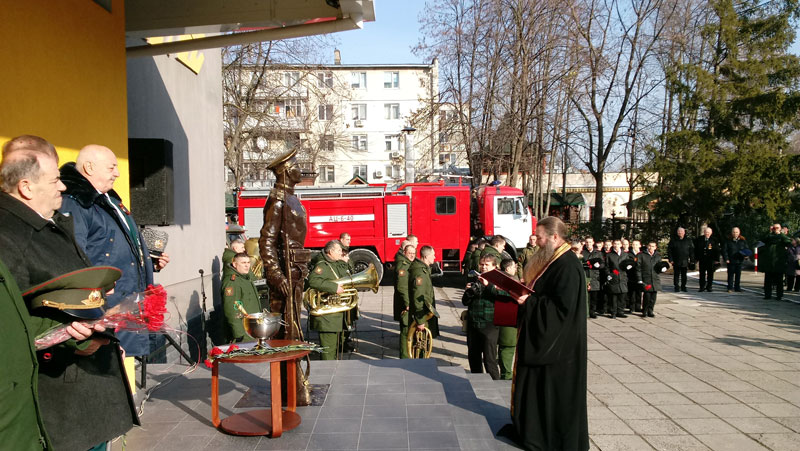 Председатель епархиального отдела по взаимодействию с Вооруженными силами, казачеством и правоохранительными учреждениями, настоятель храма во имя св. апостола Андрея Первозванного протоиерей Валерий Лознян прочитал молитву и совершил освящение монумента.
