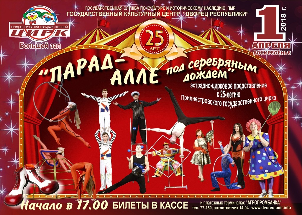 Тирасполь, 29 марта. /Новости Приднестровья/. В воскресенье, 1 апреля, Приднестровский государственный цирк даст большое представление, посвященное 25-летию творческого коллектива. Мероприятие состоится во Дворце Республики.