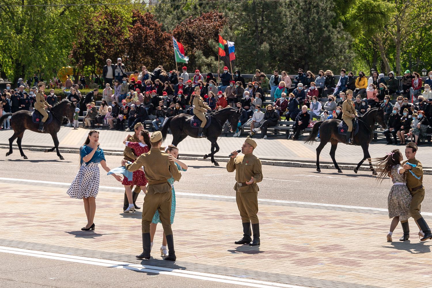 Тирасполь, 9 мая. /Новости Приднестровья/. Под занавес Военного парада - 2021 по площади Суворова в Тирасполе прошёл конный расчёт МВД ПМР.