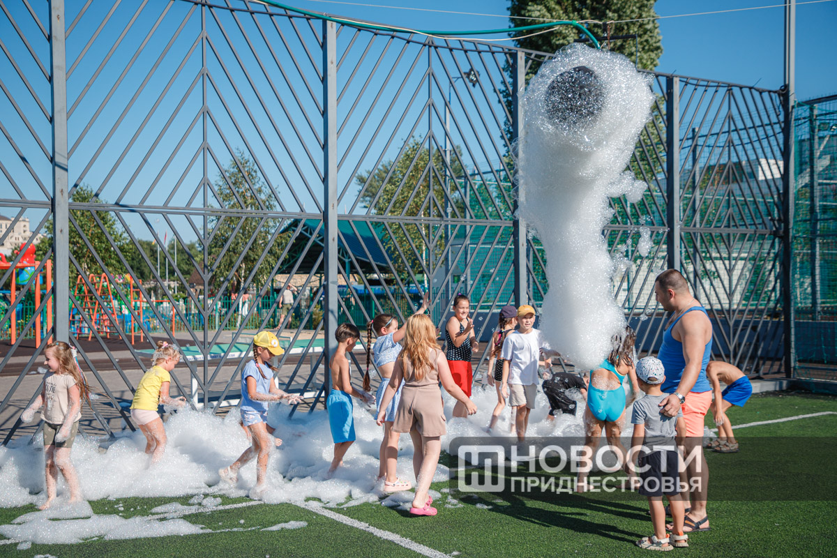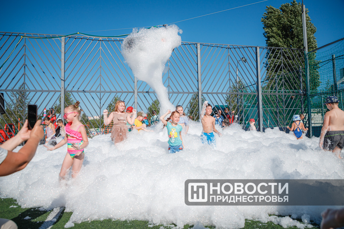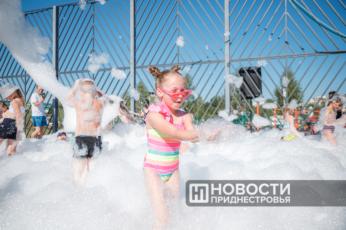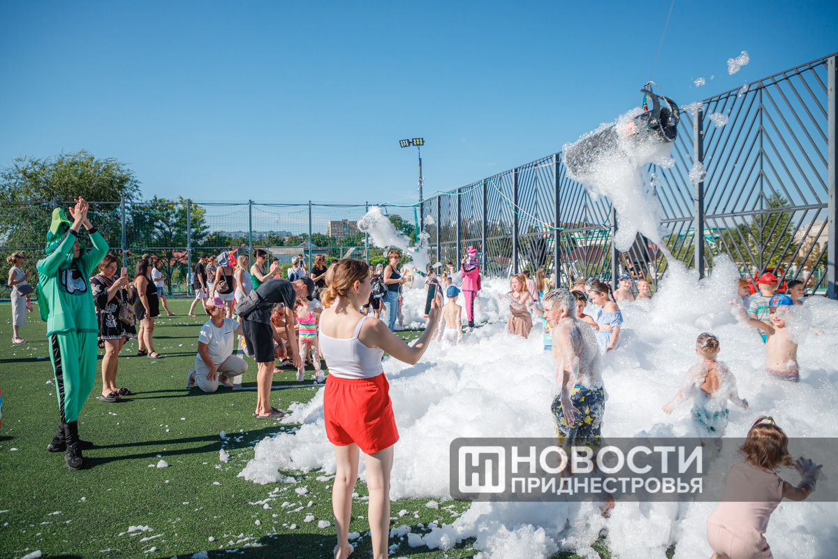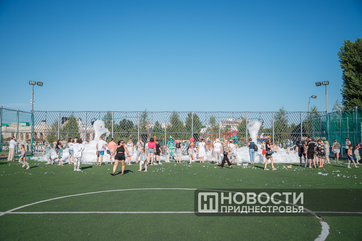 Тирасполь, 28 июля. /Новости Приднестровья/. Вечер воскресенья в Тирасполе прошёл весело. Сегодня на спортивной площадке Екатерининского парка для детей и взрослых организовали пенную вечеринку.