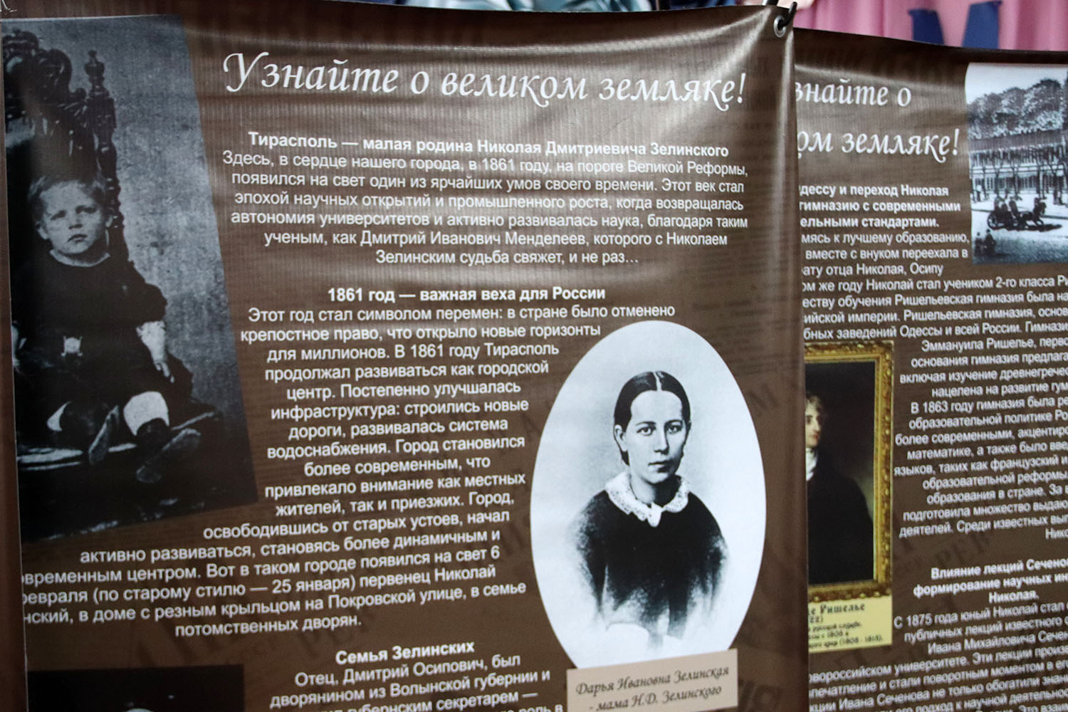 Дубоссары, 9 декабря. /Новости Приднестровья/. В Дубоссарах в молдавской средней школе № 3 открылась баннерная передвижная выставка «Н. Д. Зелинский — гордость отечественной науки». Как сообщается на сайте местной госадминистрации, экспозицию приурочили к 110-летию Первой мировой войны.