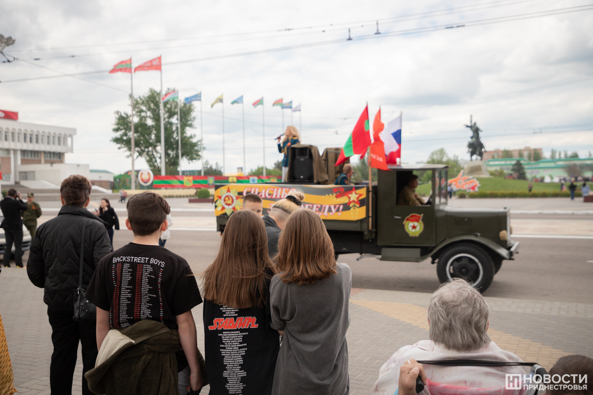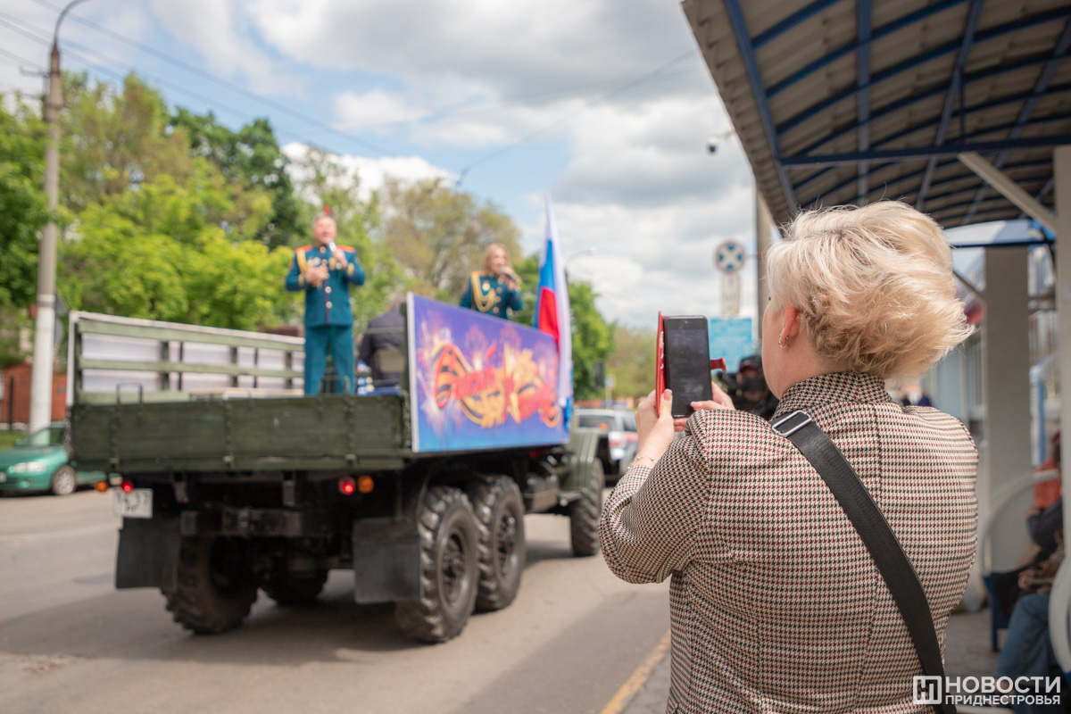 По пути следования автомобилей, стилизованных под военные полуторки, солистов приветствуют прохожие и автомобилисты: сигналят, машут, поздравляют с Днем Победы.