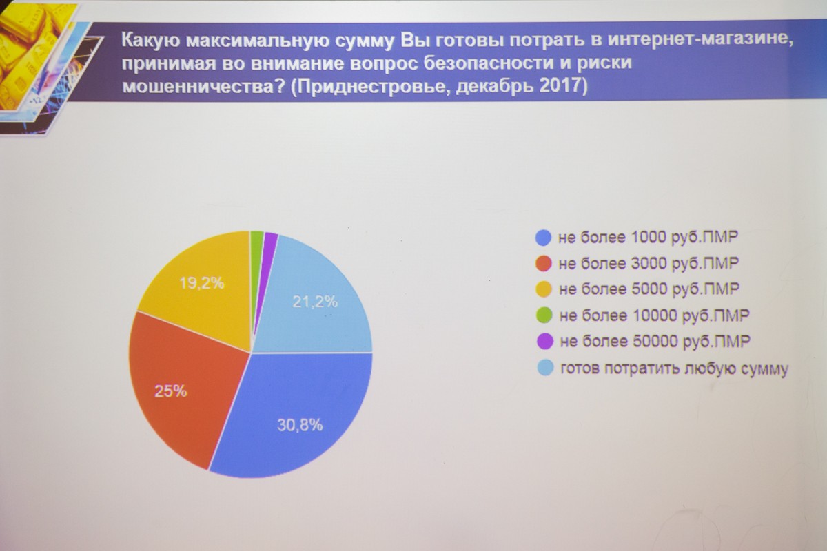 Согласно данным опроса, проводившегося ТПП в минувшем декабре, около 30% приднестровцы готовы покупать в интернет-магазинах товары не дороже 1 тыс. рублей, четверть – не дороже трех тысяч, 19,2% опрошенных готовы совершать онлайн-покупки на сумму до 5 тысяч, еще для 20% стоимость товара не имеет значения.