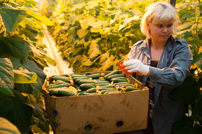 Первые ящики с салатным огурцом уже ушли в торговые сети и на рынки. С одного квадратного метра получается 13-14, максимум 16 кг, то есть в зимний сезон – до конца мая – здесь планируют собрать примерно 350-400 тонн. В следующем – осеннем – обороте урожай обычно меньше – порядка 3-5 кг с метра.