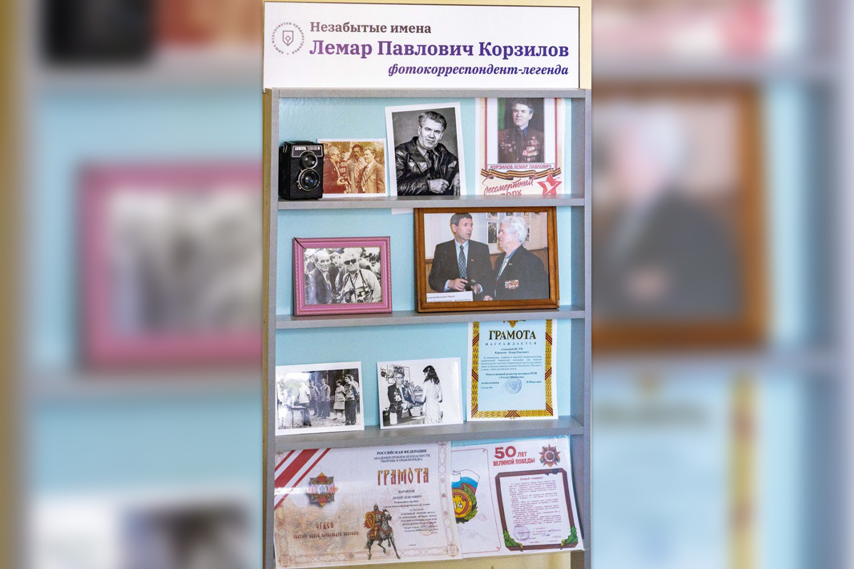 На стенде в фойе ГУ «Приднестровская газета» центральное место занимают редкие фотографии, на которых изображены уже сам ветеран журналистики, его дипломы, газетные и журнальные вырезки о нем, фотоаппарат, с которым Лемар Павлович Корзилов работал долгие годы.