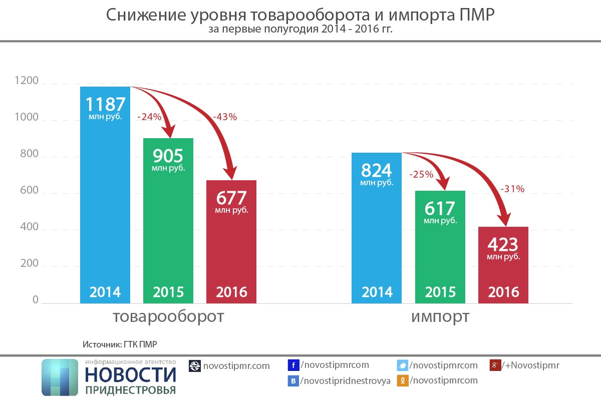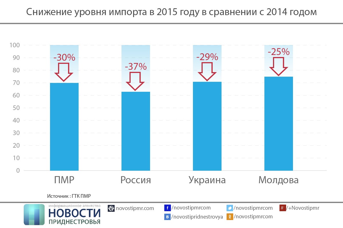Соответствующие показатели импорта в 2015-м продемонстрировали, что в условиях кризиса он упал и в мире, и в странах - основных партнерах ПМР. В Приднестровье импорт сократился на 30,4%, в РМ – на 25%, в Украине – на 29%, в РФ – на 37%.