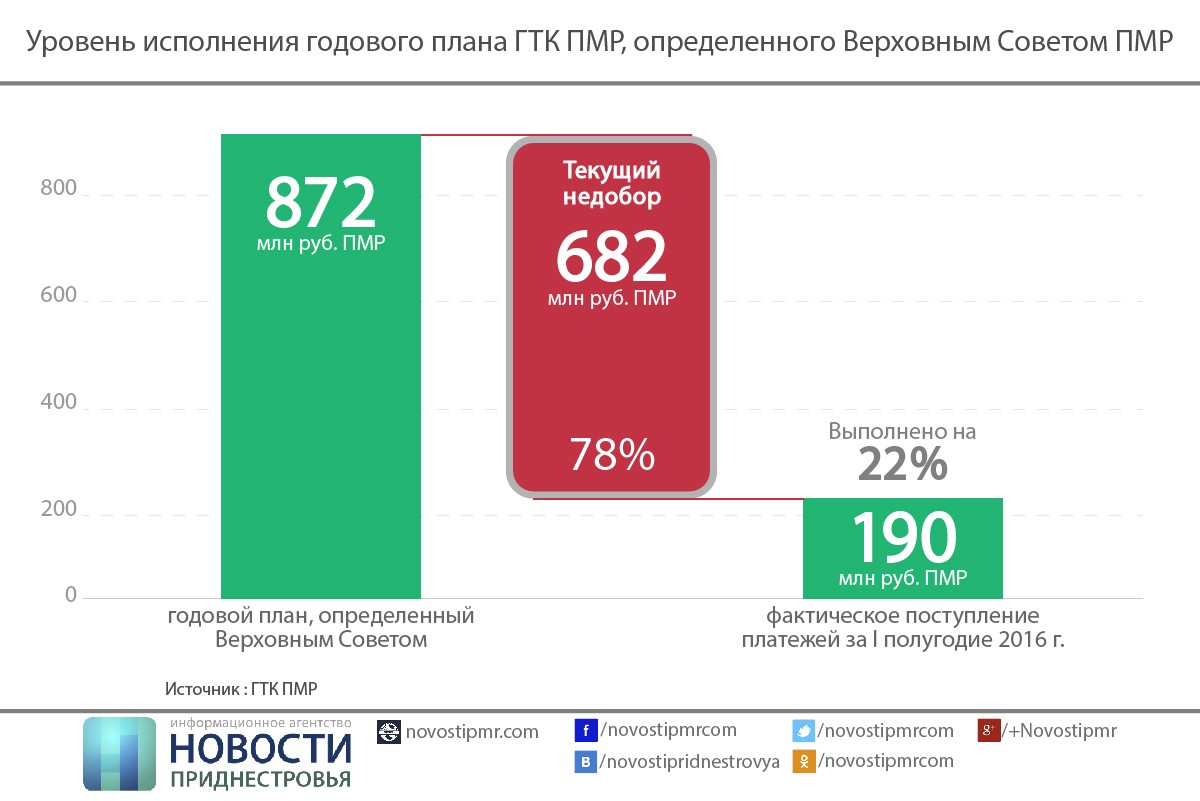 По данным ГТК, этот показатель едва достиг 190 млн рублей ПМР. Вместе с тем плановое задание ведомству, утвержденное Верховным Советом на 2016 год, составило более 870 млн рублей ПМР