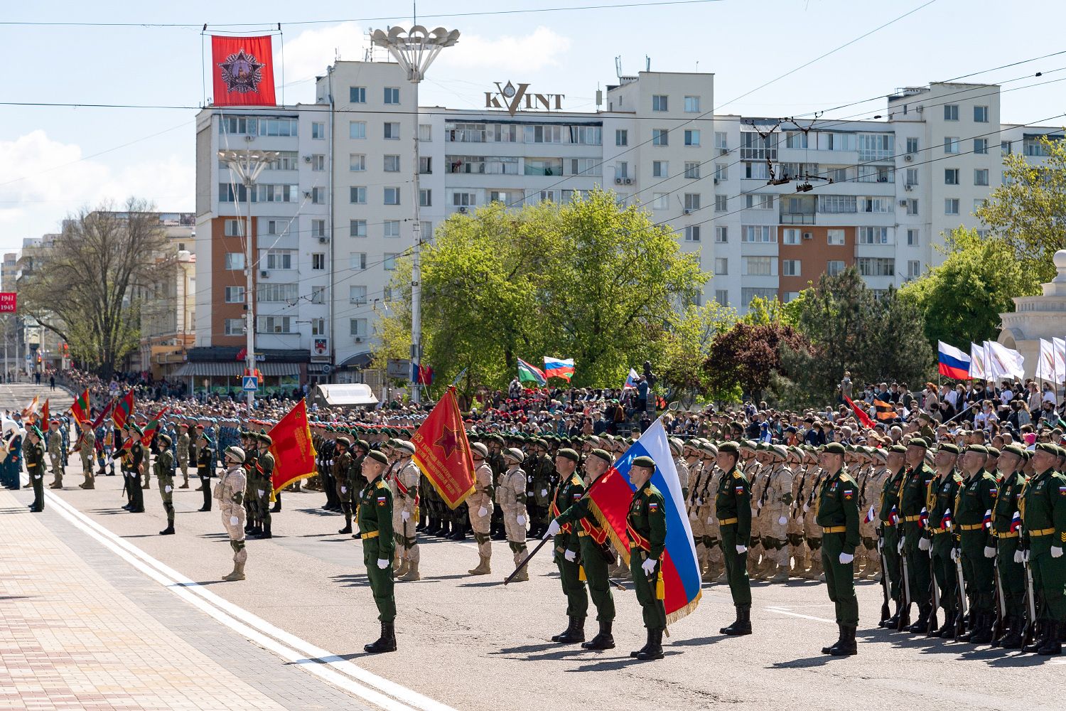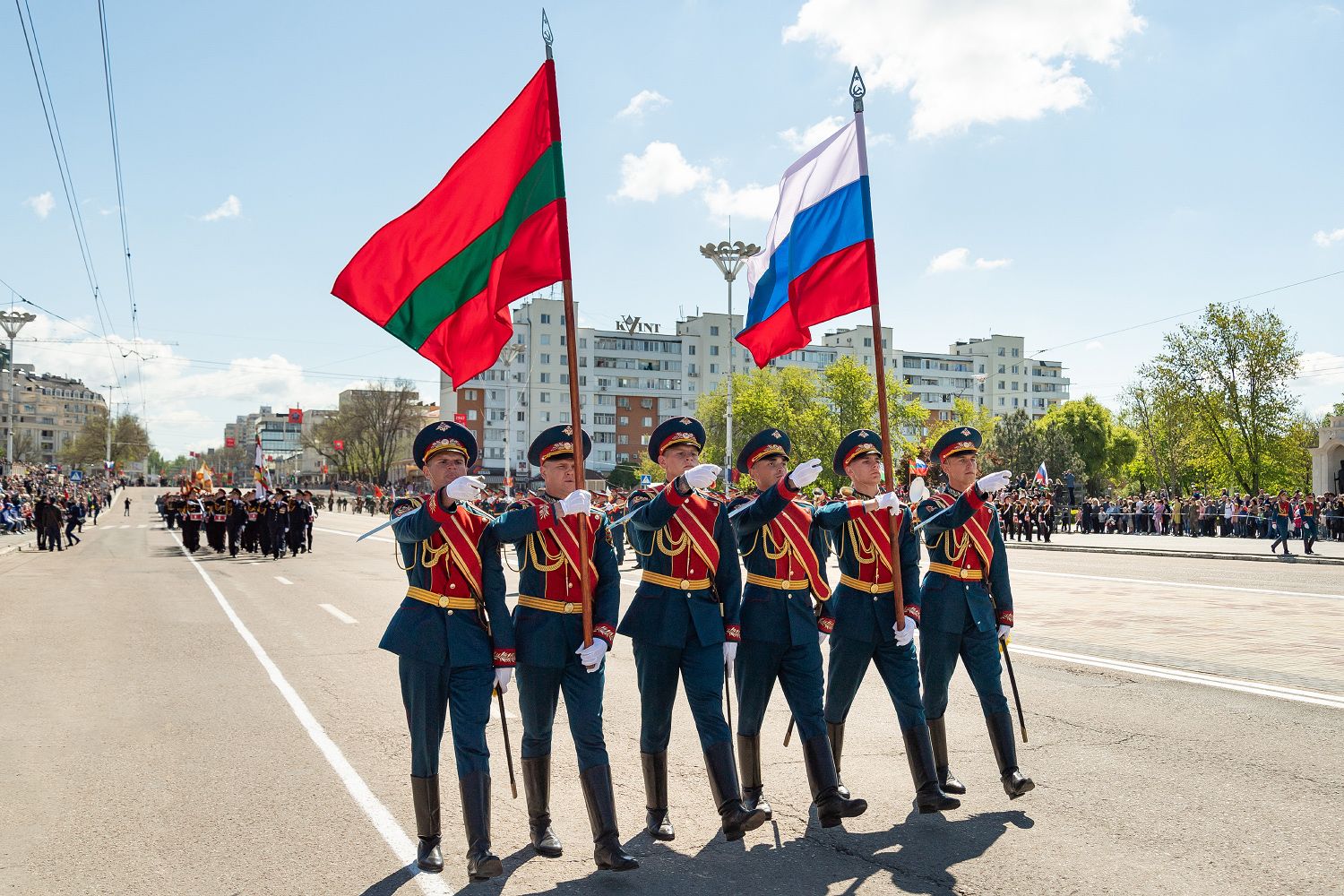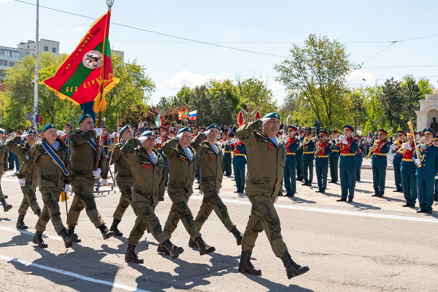 Перед почётными гостями парада – ветеранами Великой Отечественной войны и тружениками тыла – торжественным маршем прошествовали военнослужащие Вооружённых сил ПМР, Пограничного управления МГБ, МВД и подразделений Оперативной группы российских войск в Приднестровье, парадный расчет курсантов Военного института Министерства обороны в форме времен Великой Отечественной войны, а также будущие защитники Отечества – учащиеся Республиканского кадетского корпуса и Тираспольского Суворовского военного училища.