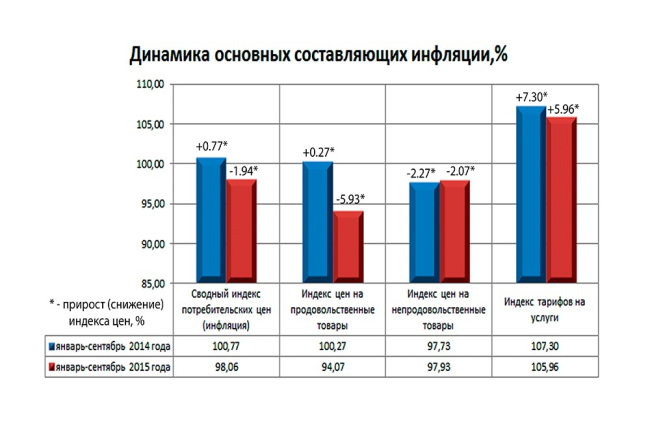По словам министра экономического развития Алевтины Слинченко, большое влияние на дефляционные процессы оказали принятые правительством решения о снижении стоимости жилищно-коммунальных услуг. Напомним, весной этого года ставка тарифа за коммунальные услуги была снижена на 7%.
