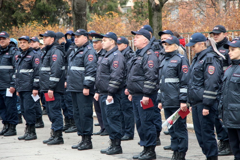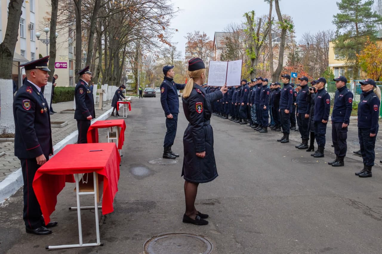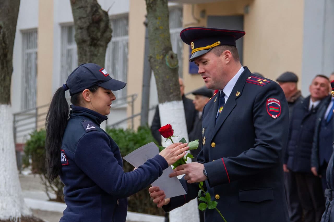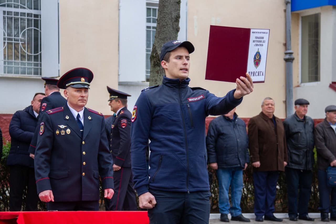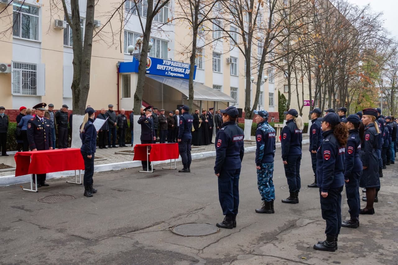 У здания УВД г. Тирасполя состоялась торжественная церемония принятия присяги молодыми сотрудниками внутренних дел, поощрение за отличие в службе и заслуги, чествование ветеранов. На мероприятии присутствовали и.о. главы госадминистрации города Геннадий Горох, председатель горсовета Вадим Дони, начальник тираспольскго УВД Сергей Кирман.