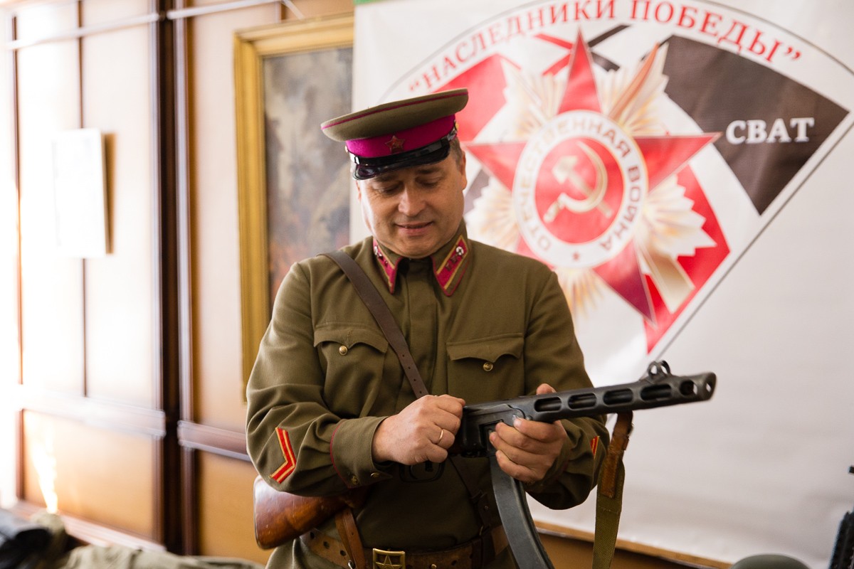 Внутри музея ещё интереснее — в одном углу военный показывает образцы оружия и рассказывает, где и когда оно применялось. Рядом девушка в форме (кстати, сотрудница музея) печатает на раритетной «Москве» важные военные сводки. В другом конце зала молодая пара (он, по-видимому, только вернулся с фронта) пьёт чай под звуки живой фортепианной музыки. А ещё патефон, граммофон, фотоаппараты, чернильницы…