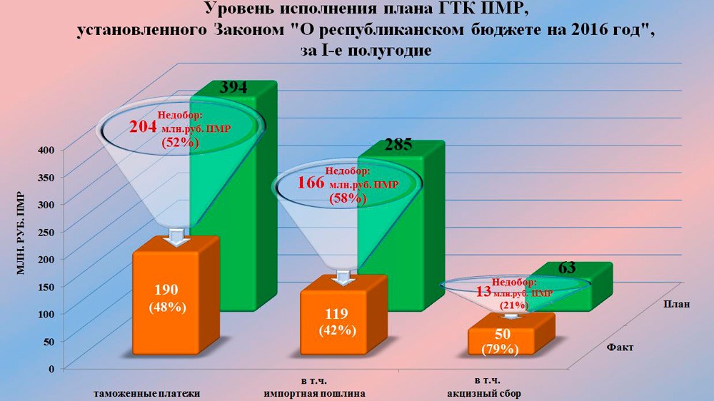 Как сообщает пресс-служба ГТК, депутатами Верховного Совета при разработке этого Закона заложено увеличение почти в 2 раза отчислений за счет акцизных сборов и таможенных пошлин. Это было сделано вопреки таможенным прогнозам на 2016 год по снижению объемов внешнеэкономической деятельности Приднестровья. Реальность их подтвердила: за первое полугодие внешний товарооборот снизился более чем на четверть в сравнении с аналогичным периодом 2015-го, и план поступлений в консолидированный бюджет республики за первое полугодие выполнен таможенными органами в целом только на 48%. При этом исполнение плановых показателей по ввозной пошлине оказалось на уровне 42%, а по акцизному сбору — на уровне 78%.