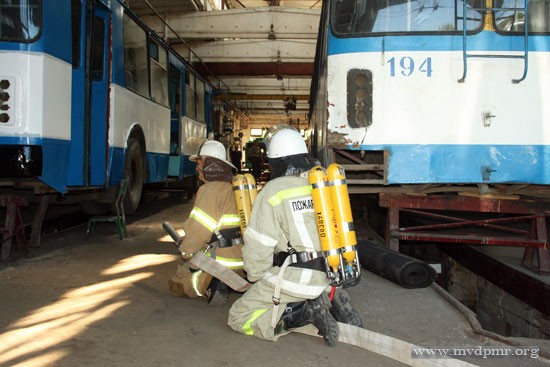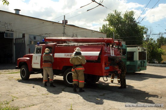 Тирасполь, 6 июля. /ИА «Новости Приднестровья"/. Пожарно-тактические занятия прошли на территории Тираспольского троллейбусного управления. В них приняли участие сотрудники Управления пожарной охраны и троллейбусного парка. Согласно условной задаче, в покрасочном цехе произошло короткое замыкание электропроводки с последующим возгоранием легковоспламеняющихся элементов. К месту вызова прибыли два пожарных расчета СВПЧ-1 в составе 11 человек, сообщает пресс-служба МВД ПМР.