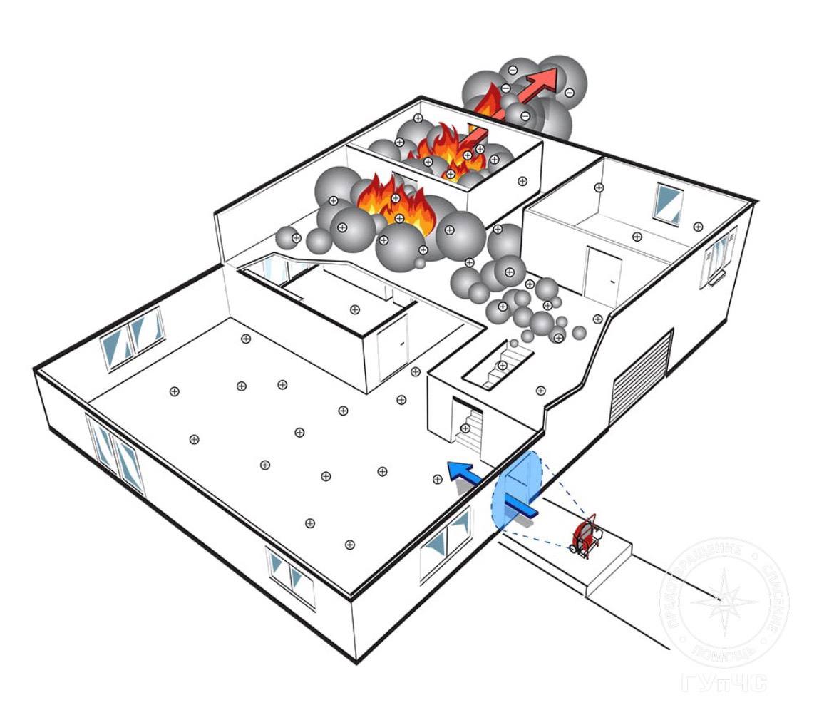 Для этого используют специальное оборудование - вытяжные и приточные вентиляторы. Благодаря нагнетанию воздуха создаётся давление и происходит вытеснение дыма, что позволяет создать оптимальные условия для защиты пострадавших и огнеборцев.