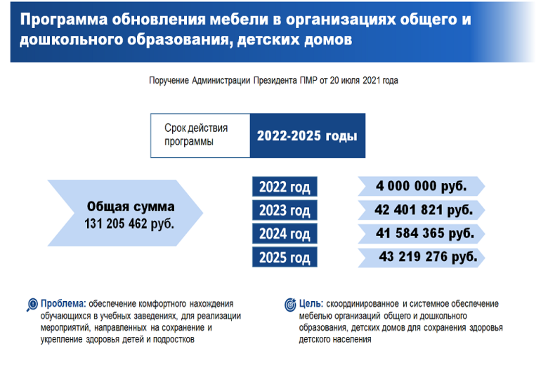 Еще одна новая для 2022 года - программа обновления мебели в организациях общего и дошкольного образования, детских домах на 2022-2025 годы. Она разработана по поручению Президента ПМР. Общая сумма на реализацию программы – 131 млн руб. На 2022-й год планируется потратить 4 млн рублей. На эти средства закупят столы, стулья, прикроватные тумбочки для детских садов, одно- и трехэлементные доски для школ.