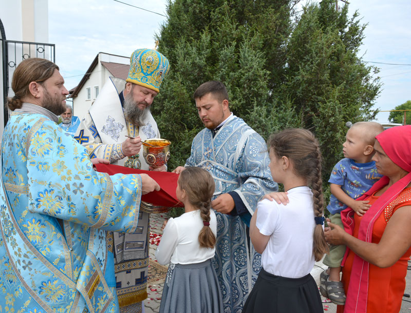 В завершение литургии состоялось славление святому образу Божией Матери, чтимой сегодня Православной Церковью, после чего Архиепископ Савва окропил всех богомольцев святой водой.