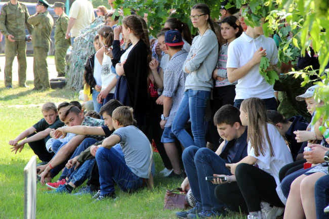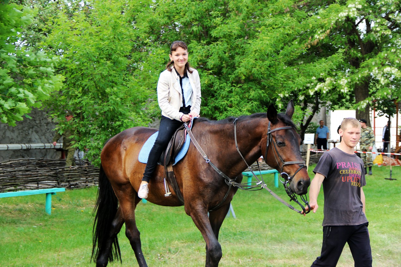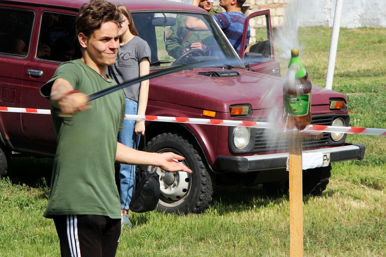Когда звуки выстрелов затихают, гости праздника массово направляются к локациям, на которых можно не только зарядиться позитивными эмоциями, но и ощутить себя в роли воина-защитника. Так, казаки-черноморцы проводили мастер-класс по владению холодным оружием. После небольшого инструктажа всем желающим предоставлялась возможность проявить себя в деле: шашка раз за разом рассекала на две части пластиковую бутылку с водой. Детей самой младшей возрастной группы катали на лошадях и учили держаться в седле.