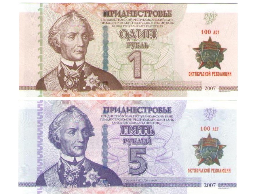 Памятные банкноты «100 лет Великой Октябрьской социалистической революции» выпущены номиналами 1 и 5 рублей ПМР. Купюры имеют формат и дизайн, аналогичные банкнотам модификации 2012 года соответствующего номинала с нанесением в правом поле лицевой стороны банкноты специальной маркировки с изображением ордена «Октябрьской революции».