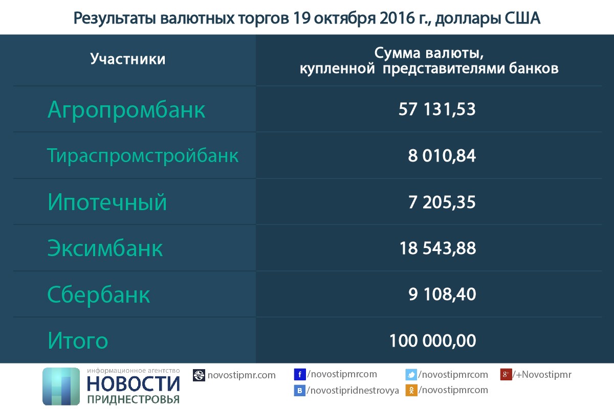 Тирасполь, 19 октября. /ИА «Новости Приднестровья"/. Как сообщает Отдел общественных коммуникаций ПРБ, совокупный спрос на торгах валютного аукциона Приднестровского республиканского банка 19 октября 2016 года составил в эквиваленте 48 094 405.61 долларов США.