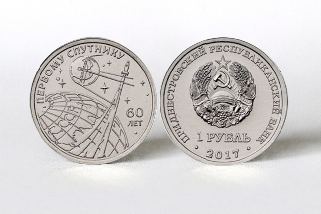 Первая - «60 лет запуска первого искусственного спутника Земли» - выполнена из драгоценного металла (серебра) номиналом 20 рублей ПМР. Данная монета продолжила серию «Освоение космоса». Её тираж - 300 штук.