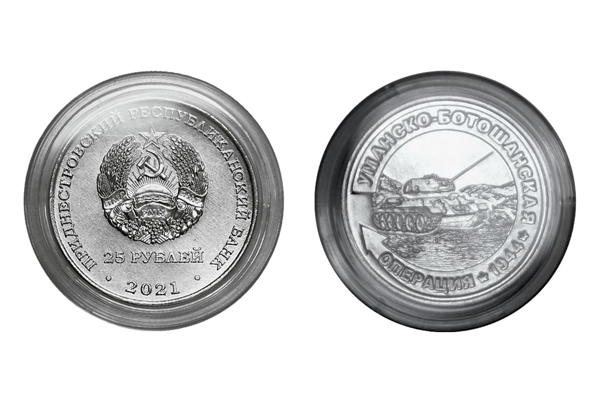 Тирасполь, 15 апреля. /Новости Приднестровья/. Приднестровский республиканский банк ввел в обращение памятные монеты «Уманско-Ботошанская операция» серии «Великая Отечественная война в истории Приднестровья». Они выполнены из недрагоценных металлов достоинством 25 рублей. Тираж монет – 2,5 тысячи штук. На реверсе в центре изображен танк, форсирующий реку.
