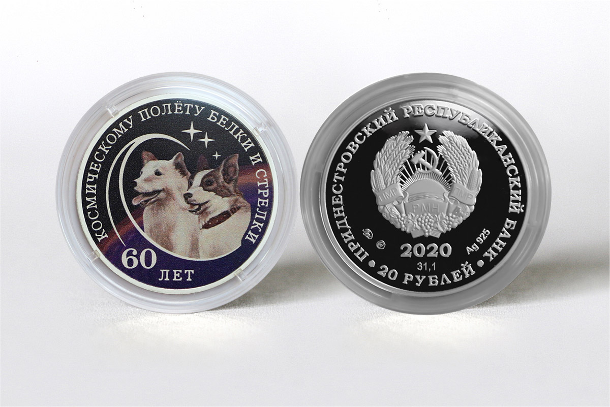 Памятная монета номиналом 20 рублей изготовлена из серебра 925 пробы. На аверсе в центре изображён Государственный герб ПМР, на реверсе в центре – крупным планом цветное изображение собак Белки и Стрелки, совершивших космический полёт, на фоне планеты Земля и звёздного неба. Памятная монета выпущена тиражом 200 штук, имеет идентификационный сертификат (паспорт), упакована в прозрачную капсулу и представлена в футляре.
