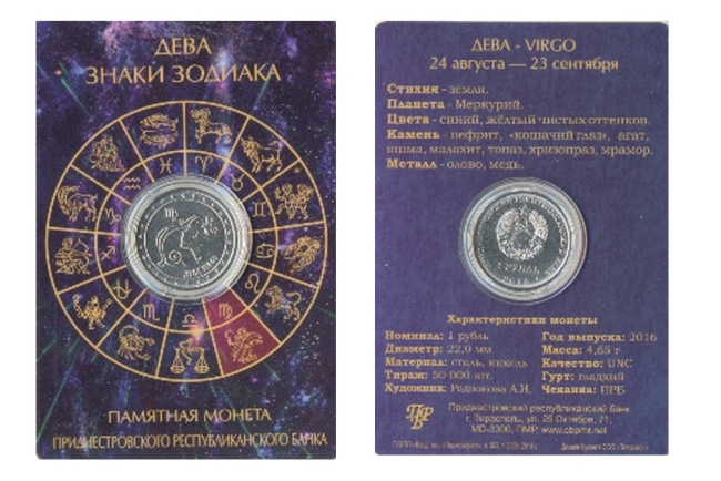 Тирасполь, 10 августа. /ИА «Новости Приднестровья"/. Приднестровский республиканский банк выпустил буклет с памятной монетой «Дева» серии «Знаки зодиака» из недрагоценных металлов номиналом 1 рубль.