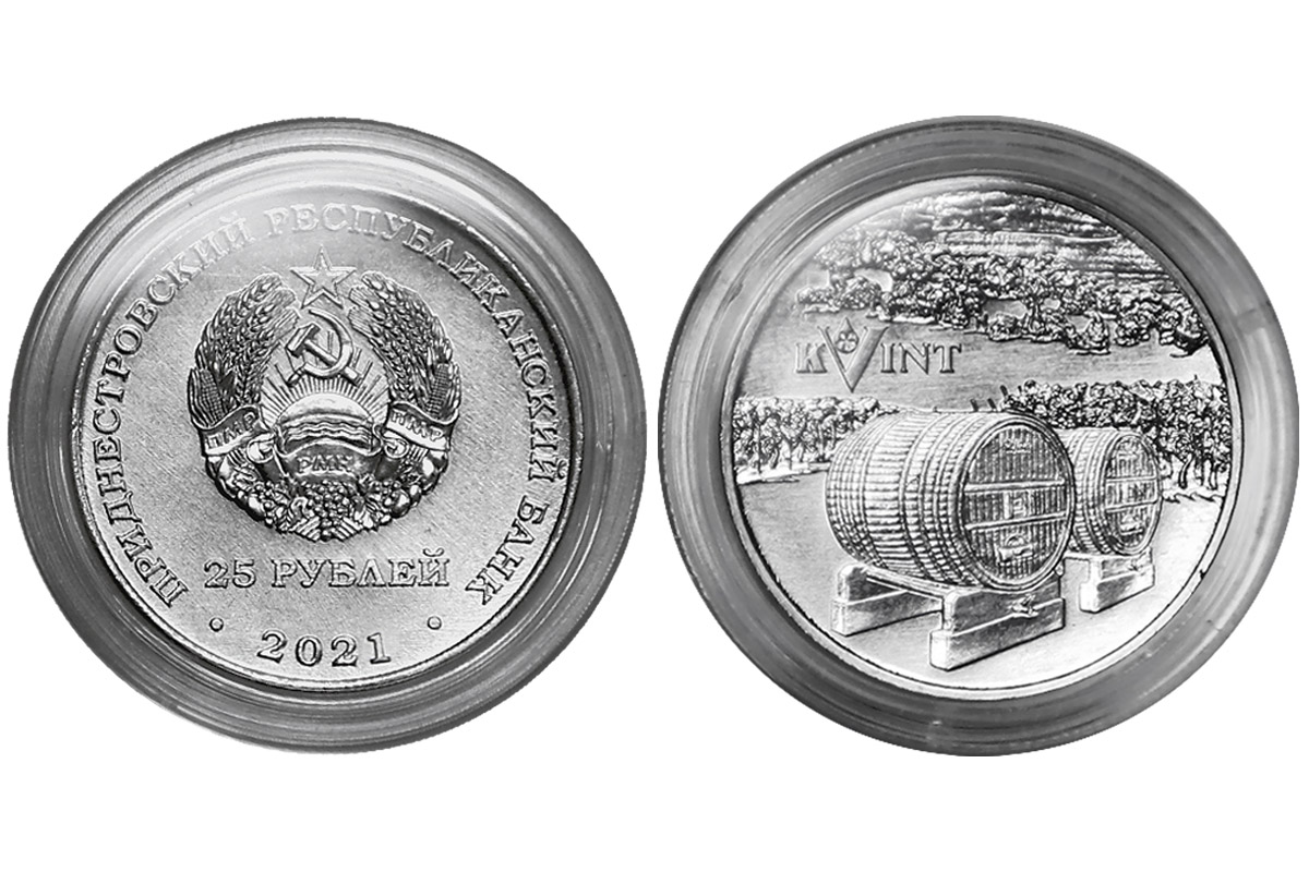Как сообщается на официальном сайте ПРБ, новая монета номиналом 25 рублей отчеканена из стали, покрытой белым никелем, тиражом в 2 500 экземпляров. На её лицевой стороне изображены государственный герб ПМР, цифры «2021» и номинал – 25 рублей. На оборотной стороне – изображение винных бочек на фоне виноградников и надпись KVINT.
