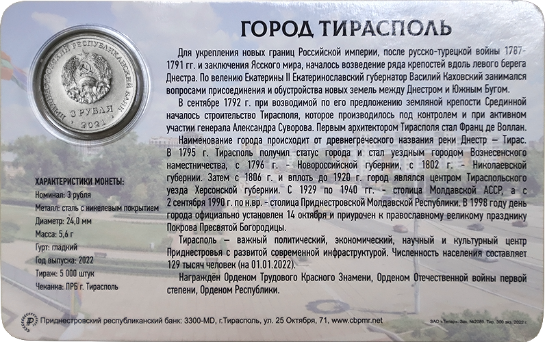 Тирасполь, 23 ноября. /Новости Приднестровья/. С сегодняшнего дня Приднестровский республиканский банк (ПРБ) вводит в обращение памятные монеты «230 лет г. Тирасполь». Они пополнят серию «Приднестровье – край родной».