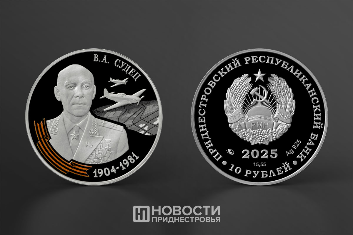 На другой монете изображен Герой Советского Союза, Народный Герой Югославии и Герой Монгольской Народной Республики маршал авиации Владимир Судец, который командовал 17-й воздушной армией, прикрывавшей войска, освобождавшие Приднестровье в ходе Одесской и Ясско-Кишиневской операций.