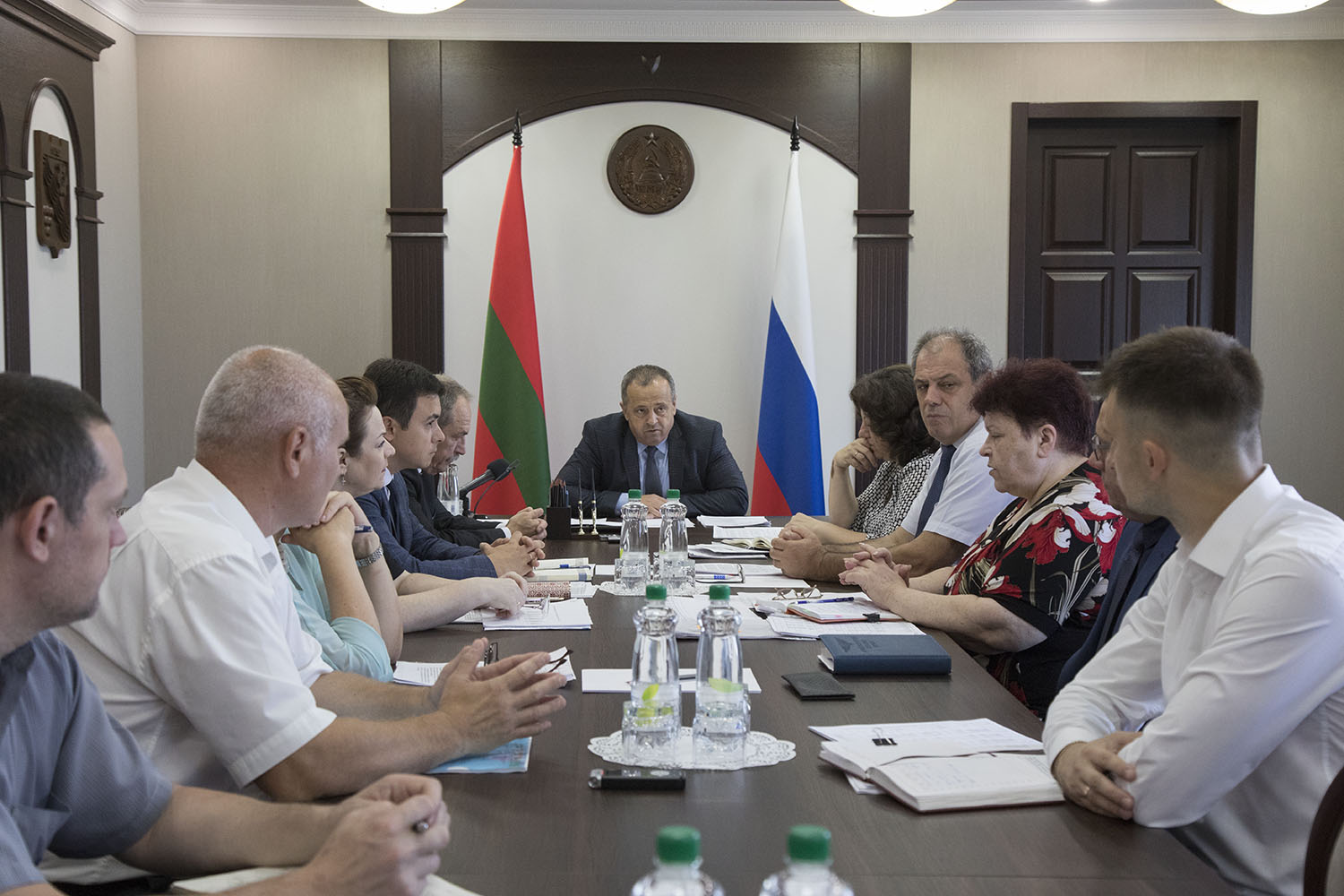 Тирасполь, 11 июля. /Новости Приднестровья/. В Правительстве прошло совещание главы исполнительной власти Александра Розенберга с руководством финансово-экономического блока, госадминистрации Бендер и проектного института. Участие во встрече принял председатель Верховного Совета Александр Коршунов.